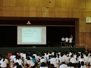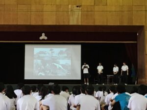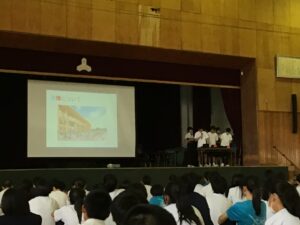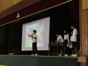 「探究」の成果発表では、1年生は「奈良方面校外学習での学びについて」、2年生は「万博での学びについて」、3年生は「修学旅行での平和学習を通して」、これまで深めてきた学びの成果を各学年の代表が発表してくれました。