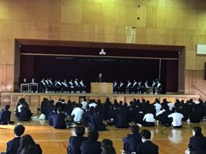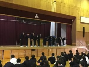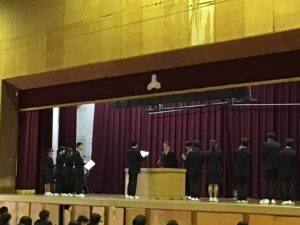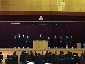 生徒会役員認証式では、まず旧生徒会役員が任期を終えてのあいさつを行い、新生徒会役員たちへエールを送りました。