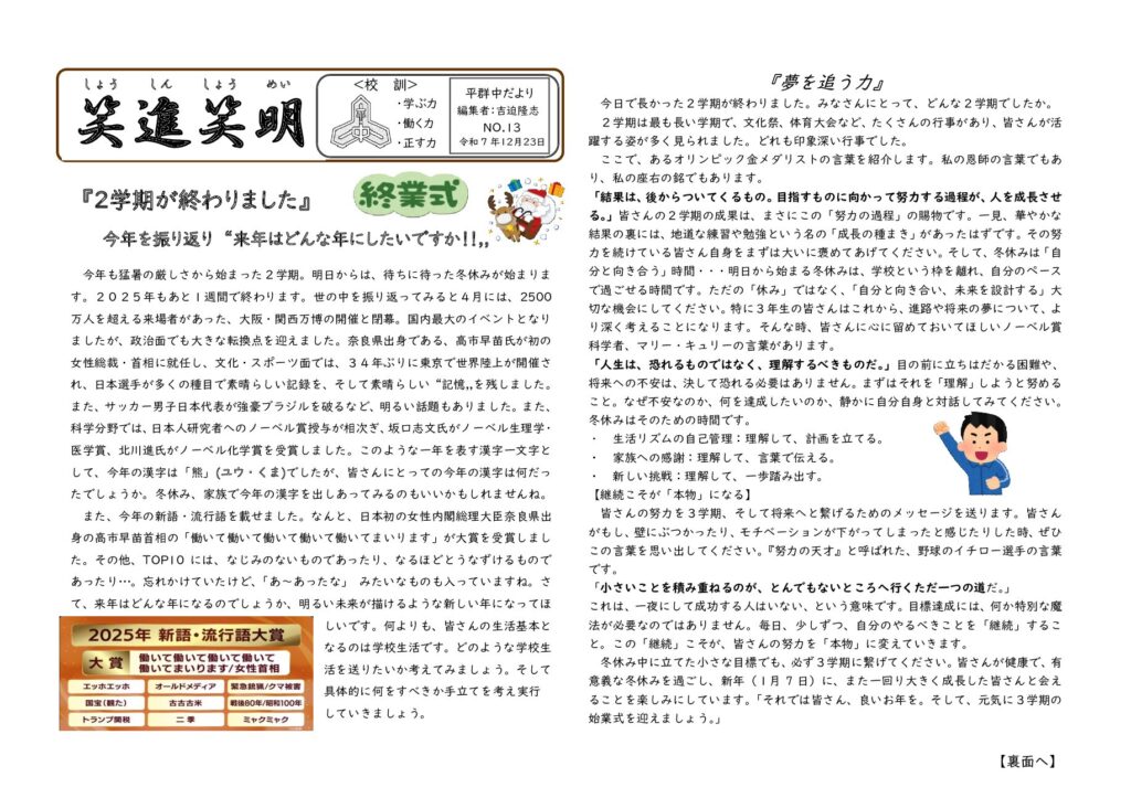 平群中だより「笑進笑明」No13,教育長だより第3号