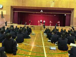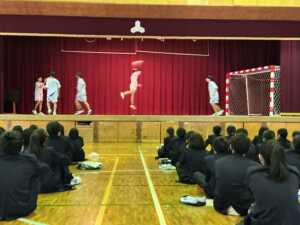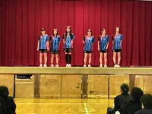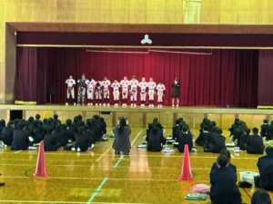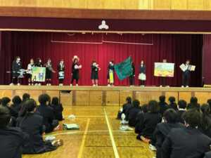 部活動紹介では、女子バレー部、家庭科部、野球部、女子卓球部、美術部、囲碁・将棋部、吹奏楽部、男子卓球部、ハンドボール部の先輩たちが工夫を凝らして楽しく活動の紹介をしてくれました。